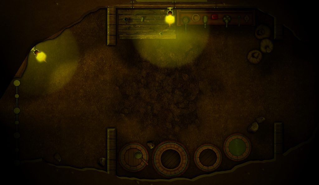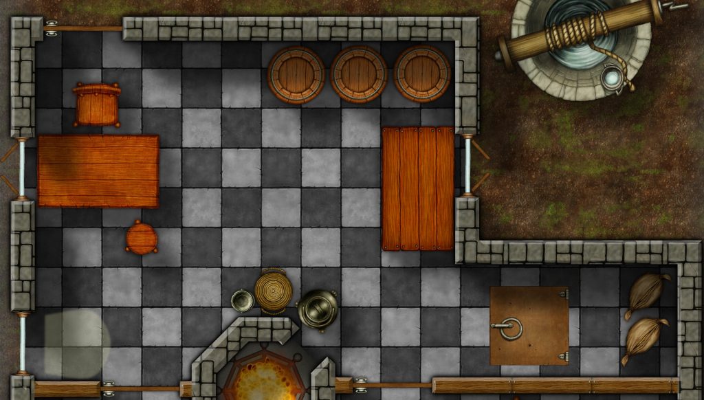 Wilfreds kök – skådeplats i Smogens herre. Någonting otrevligt tittar upp ur golvluckan.
